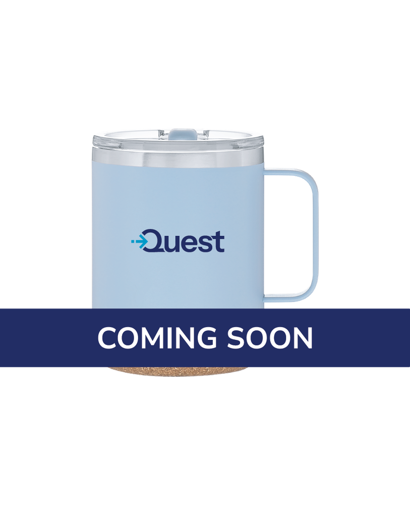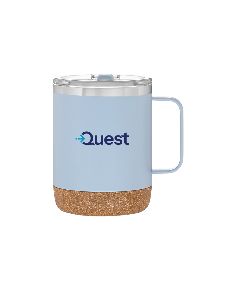 A durable 12 oz thermal mug with double‑wall stainless steel and copper vacuum insulation to keep drinks hot or cold for hours. Features a clear push‑on lid with swivel closure, stainless steel rim, synthetic cork base, and a powder‑coated finish for added grip and style.