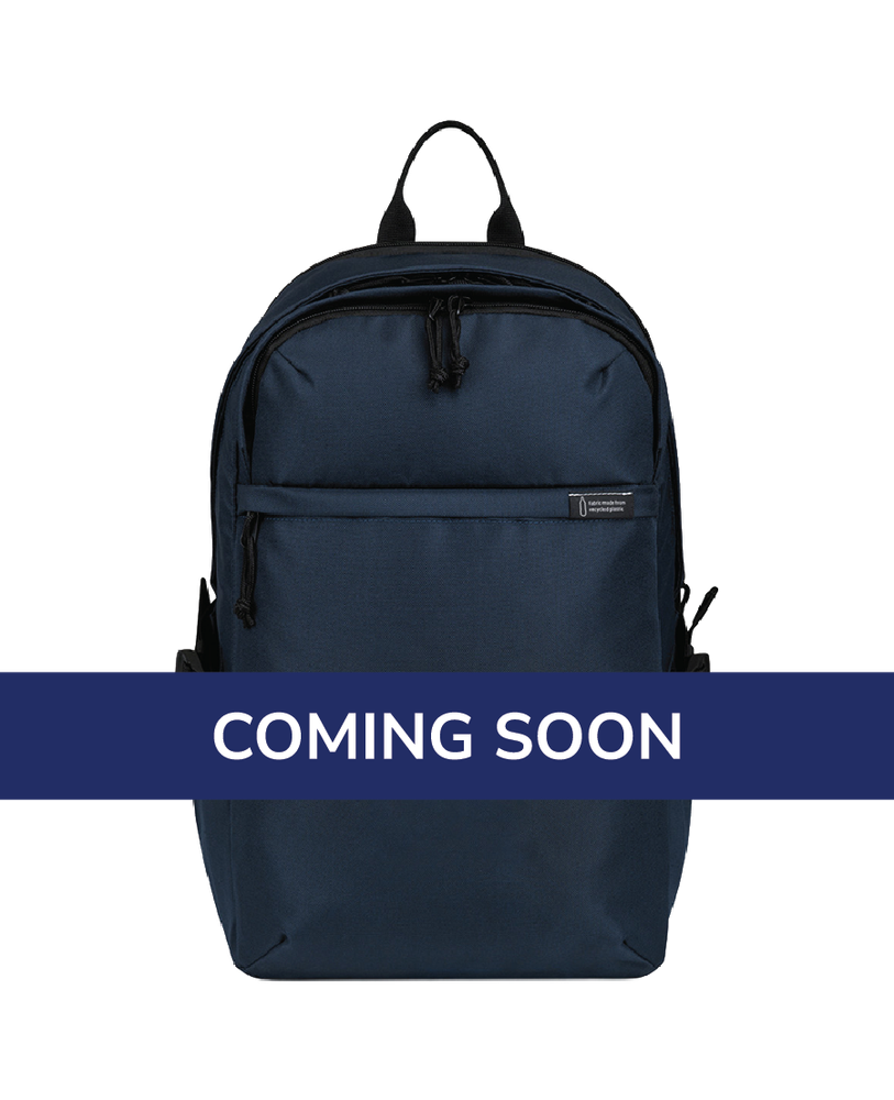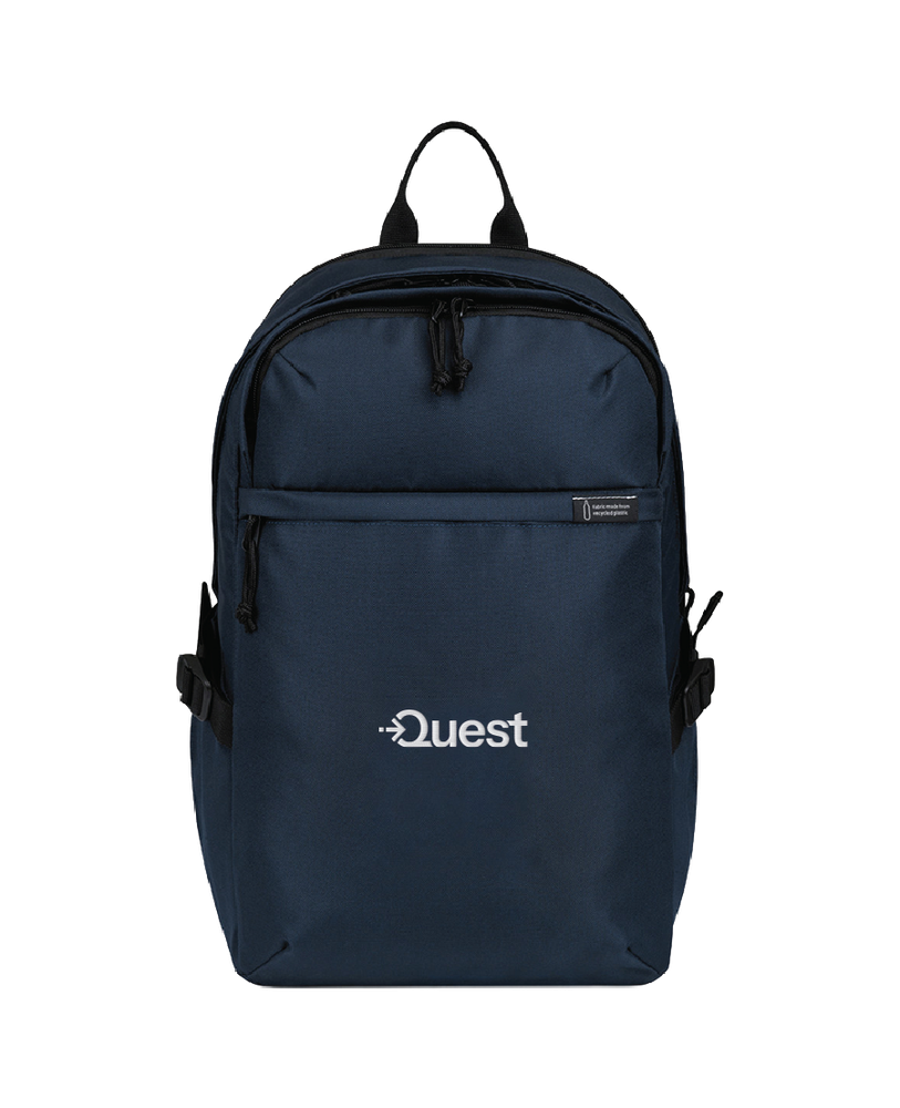 Backpack features include a top dual‑zip pocket for accessories, front zip pocket with key clip, dual side bottle pockets with compression straps, and a rear padded laptop compartment (fits up to 15"). The main compartment offers interior organization, with padded straps and back panel for comfort.
